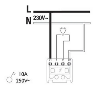 - Le fil bleu sortant doit être relié à la vis 2 et le fil foncé sortant vers la lampe doit être relié à la vis 1.
