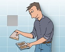 C’est le moment de préparer le mortier de jointement pour le placer tout autour de votre nouveau carrelage. Pour cela, passez la raclette en caoutchouc en poussant sur le joint dans la diagonale pour bien faire pénétrer la pâte dans les rainures.